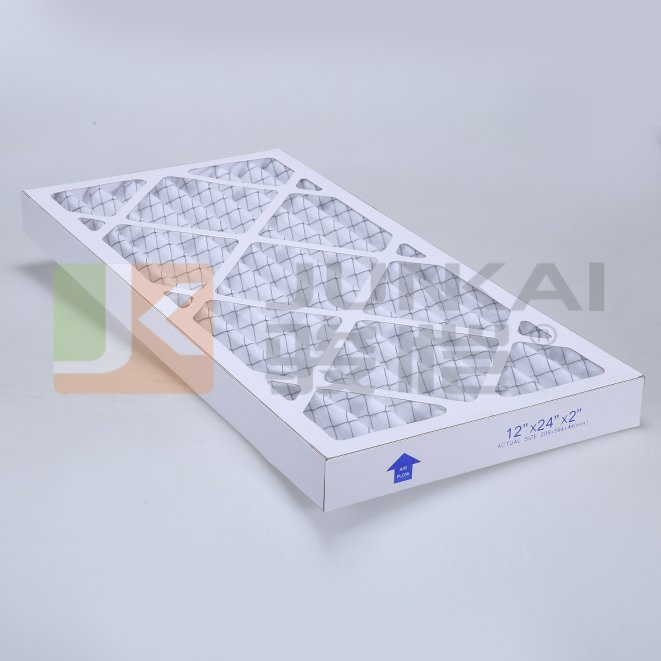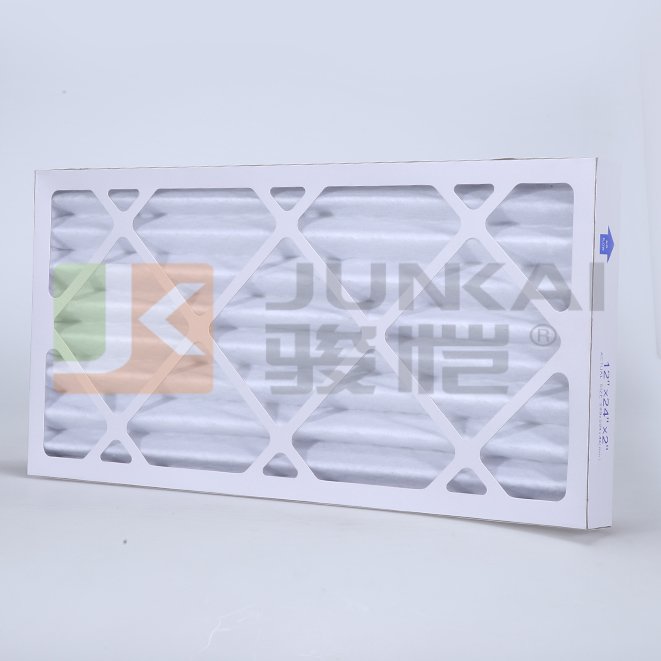 采用阻燃合成纤维滤料,出风面覆金属网支持,强度好,纸外框,防水卡纸外框,实用性强,经济实惠,用于空调通风系统初效过滤。